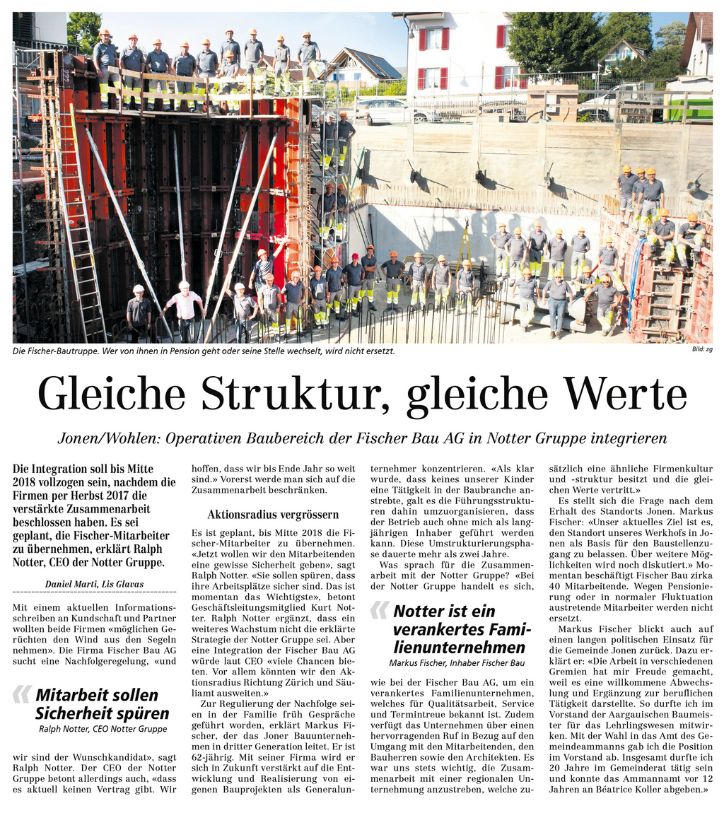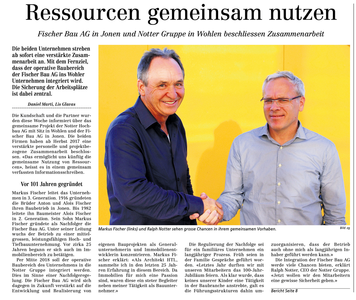 Notter Gruppe Wohlen und Fischer Bau AG Jonen beschliessen Zusammenarbeit